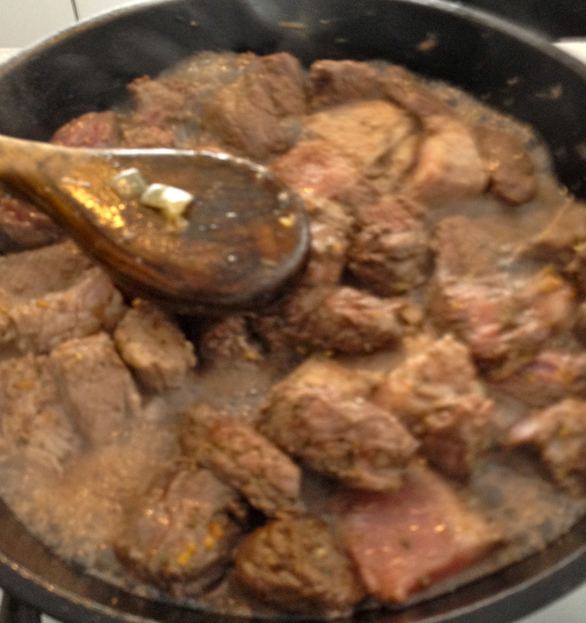 2. Chop the beef and pork into chunky pieces. Brown with garlic, basil (or Mrs.Dash), olive oil, and a splash of red wine.