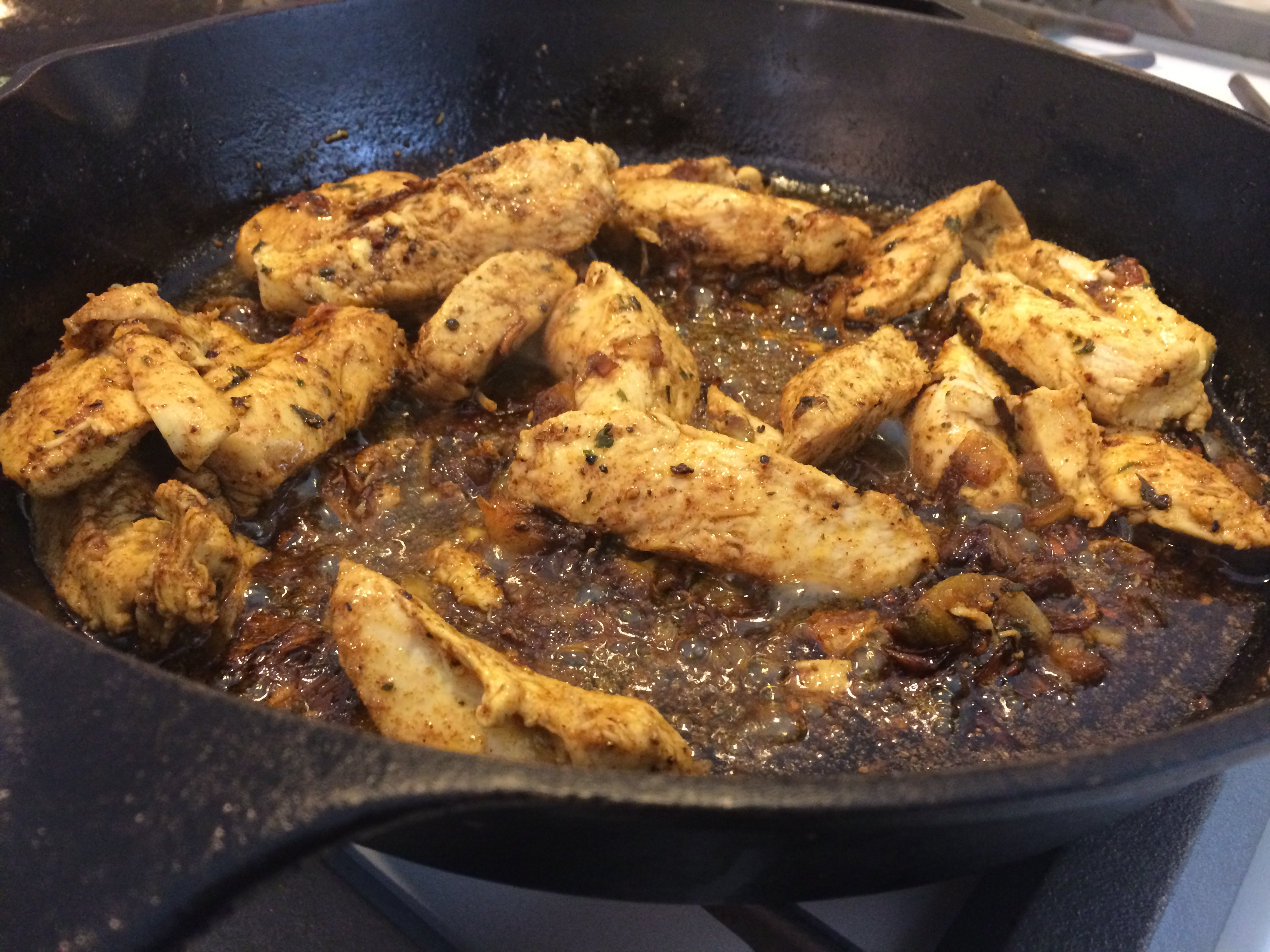 3. Place chicken in skillet with water and a dash of olive oil. Cook until nearly done. (I cook it this way, because it’s much healthier than cooking it in oil, however you may choose to pan sear it). Make sure water evaporates completely- if it’s not gone, then pour the rest of the water out before adding spices.